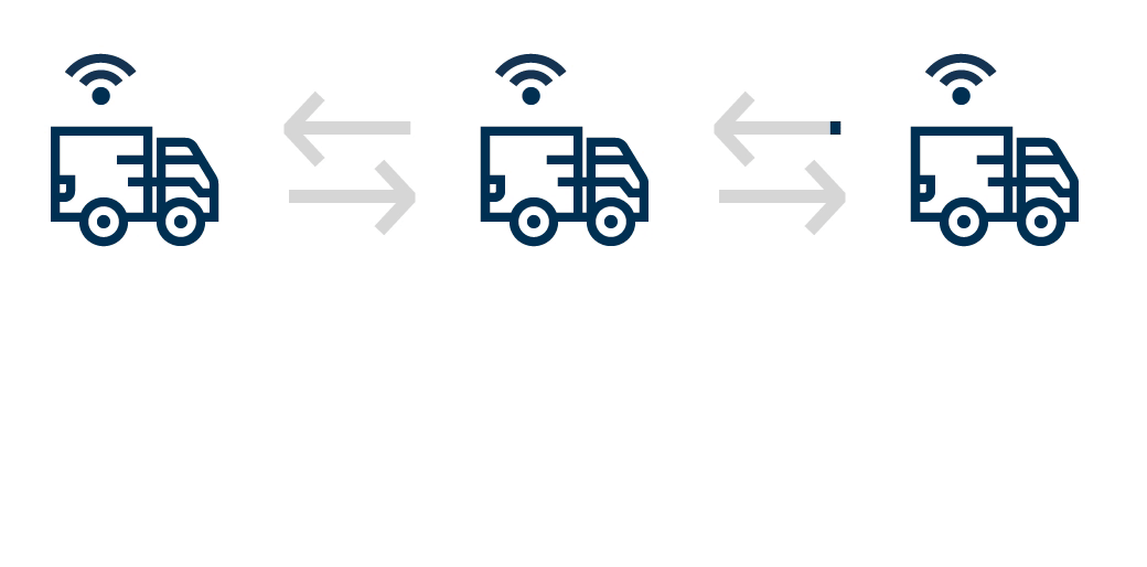 Eine Kolonne LKWs fährt auf der Autobahn. Aber bei der Arbeit ist nur ein Fahrer. Durch Sensoren und eine WLAN-ähnliche Funkverbindung stehen die Fahrzeuge in ständigem Austausch untereinander. Denn der vordere Wagen lenkt die ganze Flotte.