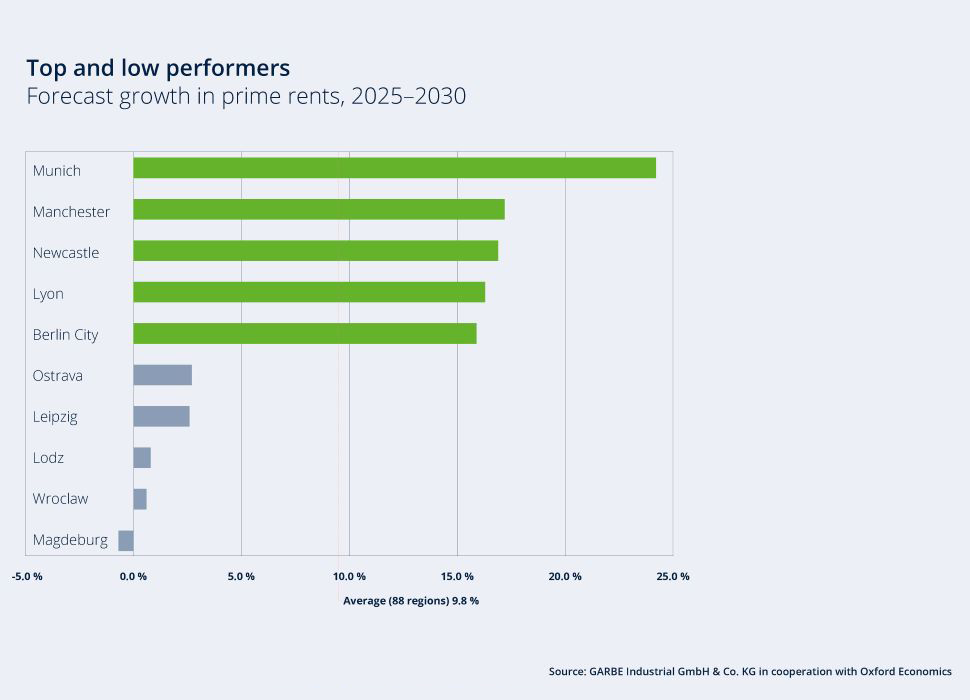 Despite the generally muted market dynamics, the GARBE forecast identifies a large number of European logistics markets that continue to show potential for growth. In fact, prime rents are expected to increase by more than ten percent in 45 of the analysed regions between now and 2030. The strongest impulses are coming from established core markets in countries like Germany, the United Kingdom, France and the Netherlands. One market that clearly stands out from the rest of the field is Munich: Strong local demand, a structurally short supply and the economic clout of the region suggest that the dynamic rent growth of recent years will continue here.