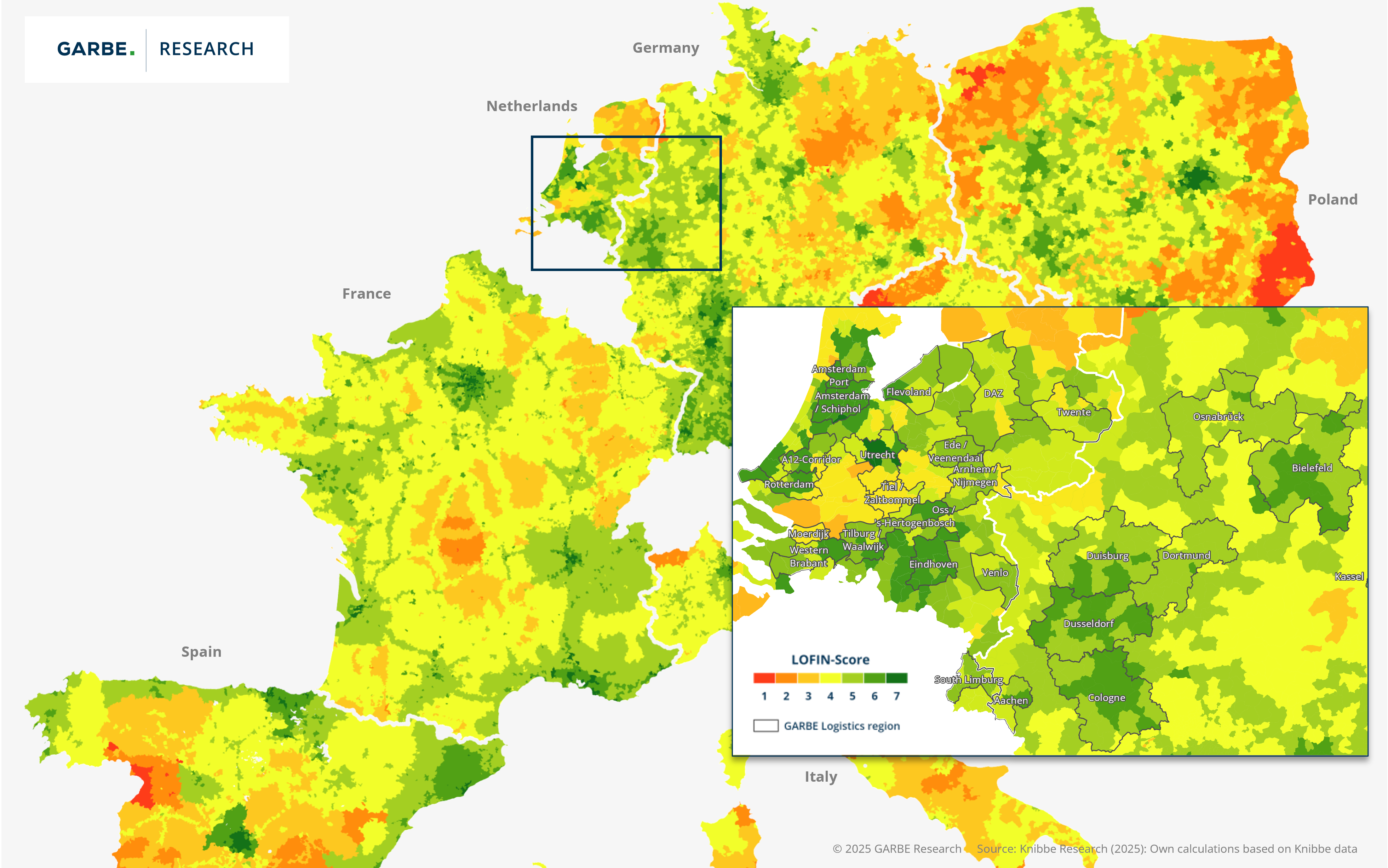 With the LOFIN Score (Logistics Affinity Score), GARBE Research has developed a data-driven analytical model that assesses the attractiveness of municipalities at the Local Administrative Unit (LAU) level for logistics uses. In a market where the demands on logistics networks continue to grow and investment decisions rely ever more on robust data, the LOFIN Score provides a structured and objective basis for strategic location decisions.
