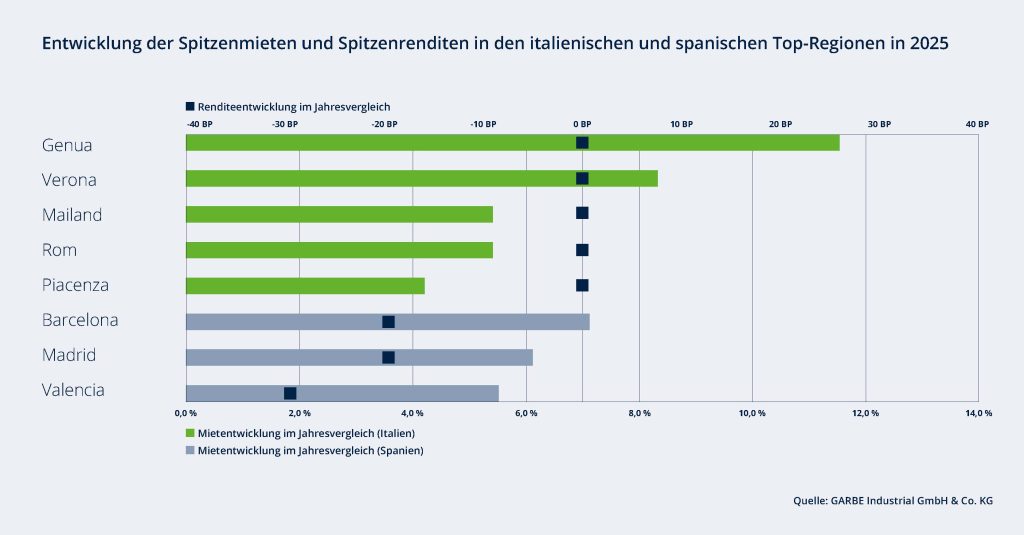 Insbesondere die Kernregionen Mailand und Rom zeigen eine stabile Performance. Starke Wachstumsimpulse kommen derzeit aus Genua, Verona und Piacenza. Im Jahresvergleich von Ende 2024 bis Ende 2025 stiegen die Spitzenmieten in Genua um 11,5 Prozent und in Verona um 8,3 Prozent, während Piacenza insbesondere im zweiten Halbjahr 2025 einen deutlichen Zuwachs verzeichnete.