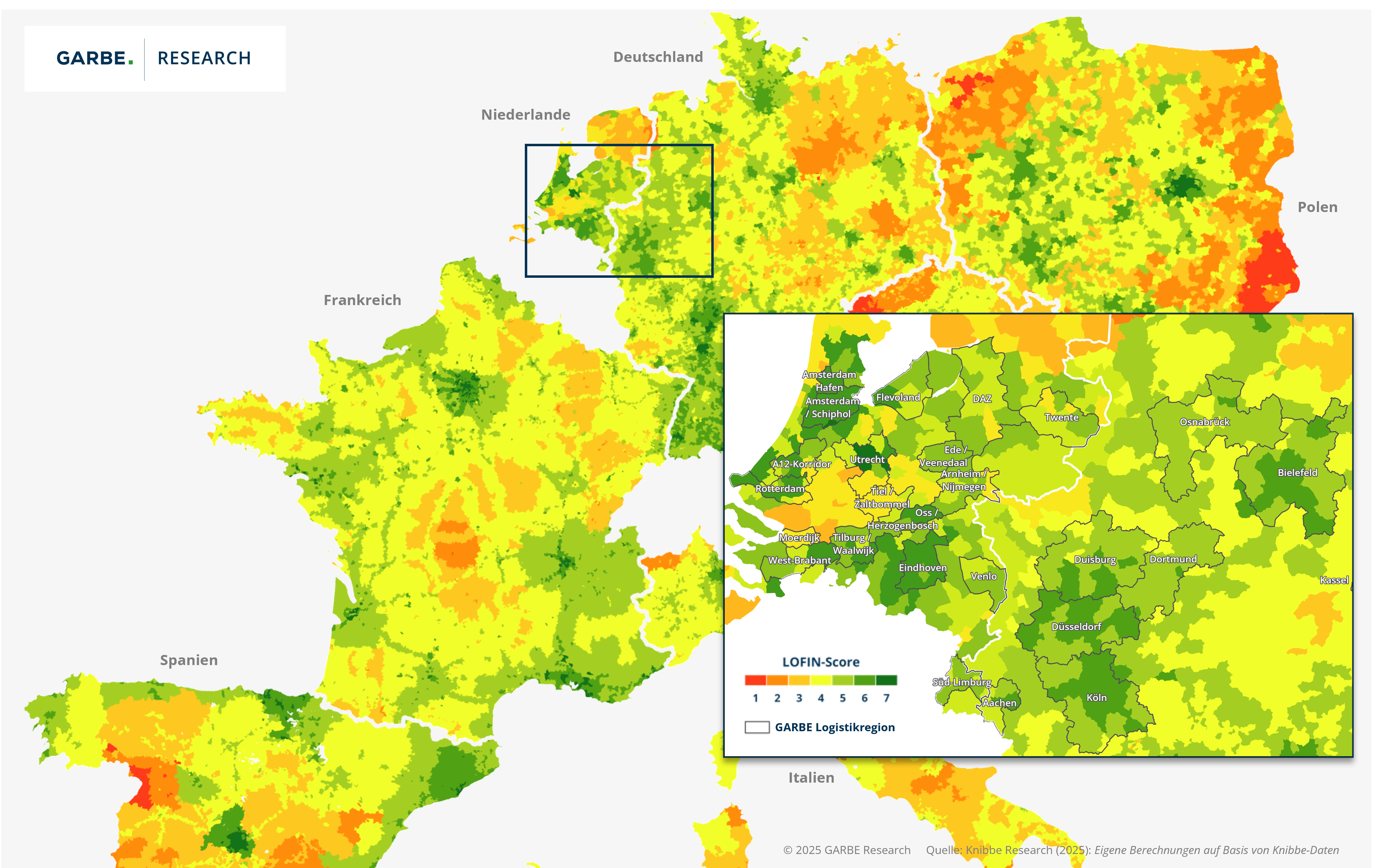 Mit dem LOFIN-Score (Logistics Affinity Score) hat GARBE Research ein datenbasiertes Analysemodell entwickelt, das die Attraktivität von Gemeinden auf Ebene der Local Administrative Units (LAU) für logistische Nutzungen bewertet. In einer Zeit, in der die Anforderungen an logistische Netzwerke stetig steigen und Investitionsentscheidungen zunehmend auf fundierten Daten basieren, bietet der LOFIN-Score eine strukturierte, objektive Grundlage für strategische Standortentscheidungen. Eine hervorstechende Besonderheit: Das Scoring ist nicht länderspezifisch, sondern dank der gezielt ausgewählten und vergleichbaren Bewertungsfaktoren in allen Ländern, in denen GARBE Industrial aktiv ist, anwendbar. Es kann zudem jederzeit auch auf weitere europäische Länder angewendet werden.